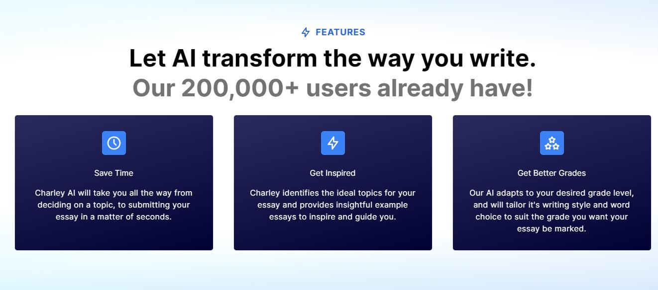在 Charley.ai,我们提供最新的人工智能写作工具,帮助您轻松撰写原创内容,告别熬夜和写作障碍的困扰,迎接无忧的写作体验。
