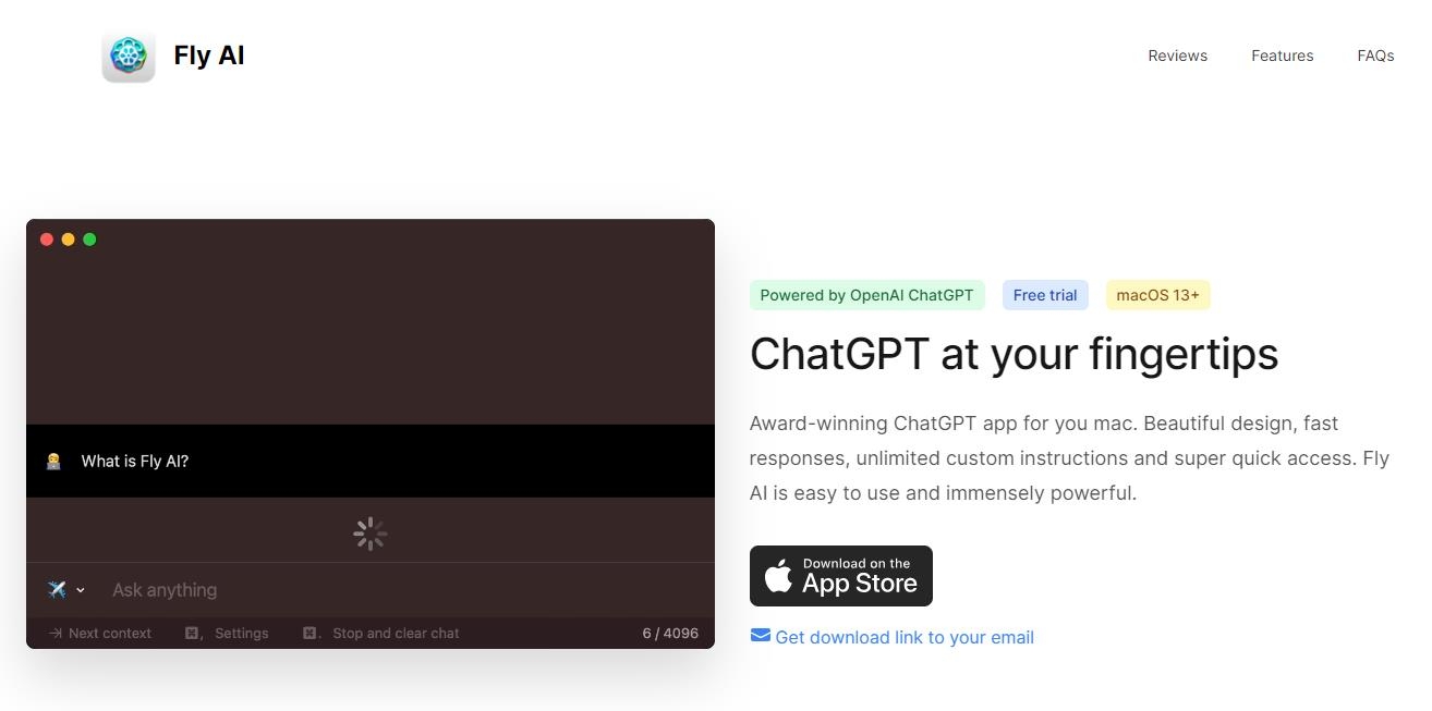 Fly AI是一款为mac用户设计的屡获殊荣的ChatGPT应用程序。凭借其美观的设计、快速的响应、无限的自定义指令和超级快捷的访问方式,Fly AI不仅易于使用,而且功能强大。
