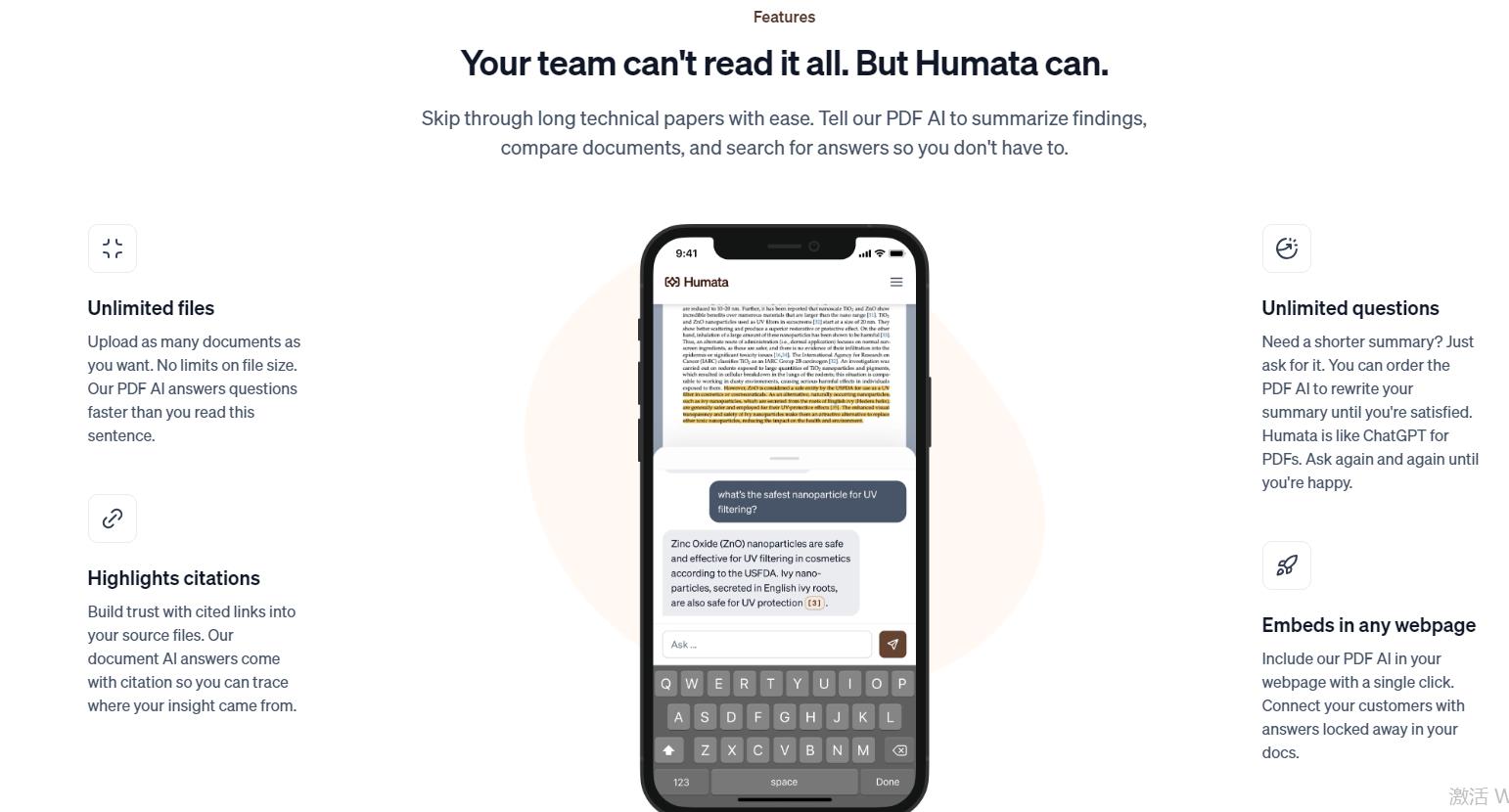 - 即时问答:针对您的文档提出的问题,Humata AI能够立即给出易于理解的答案。